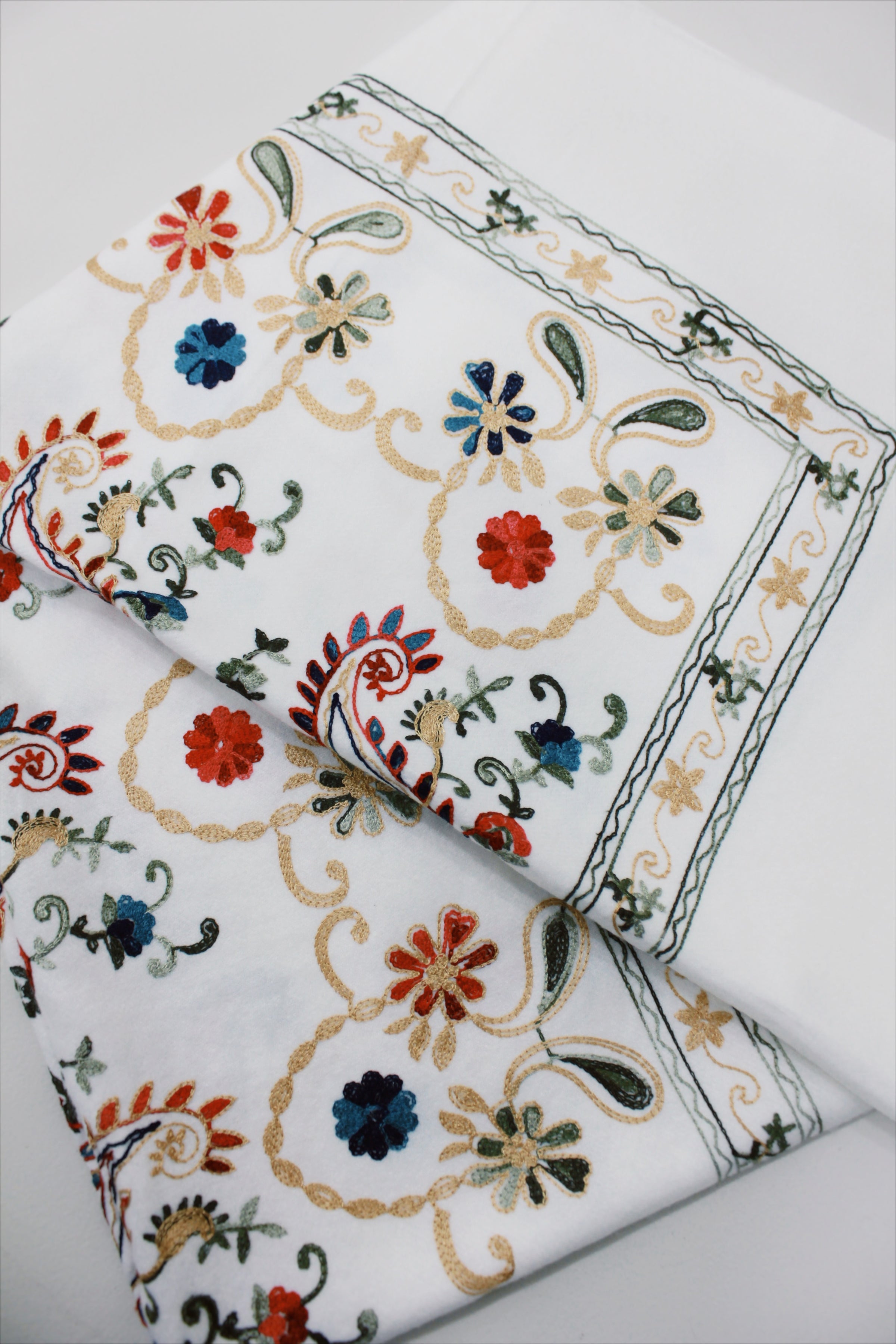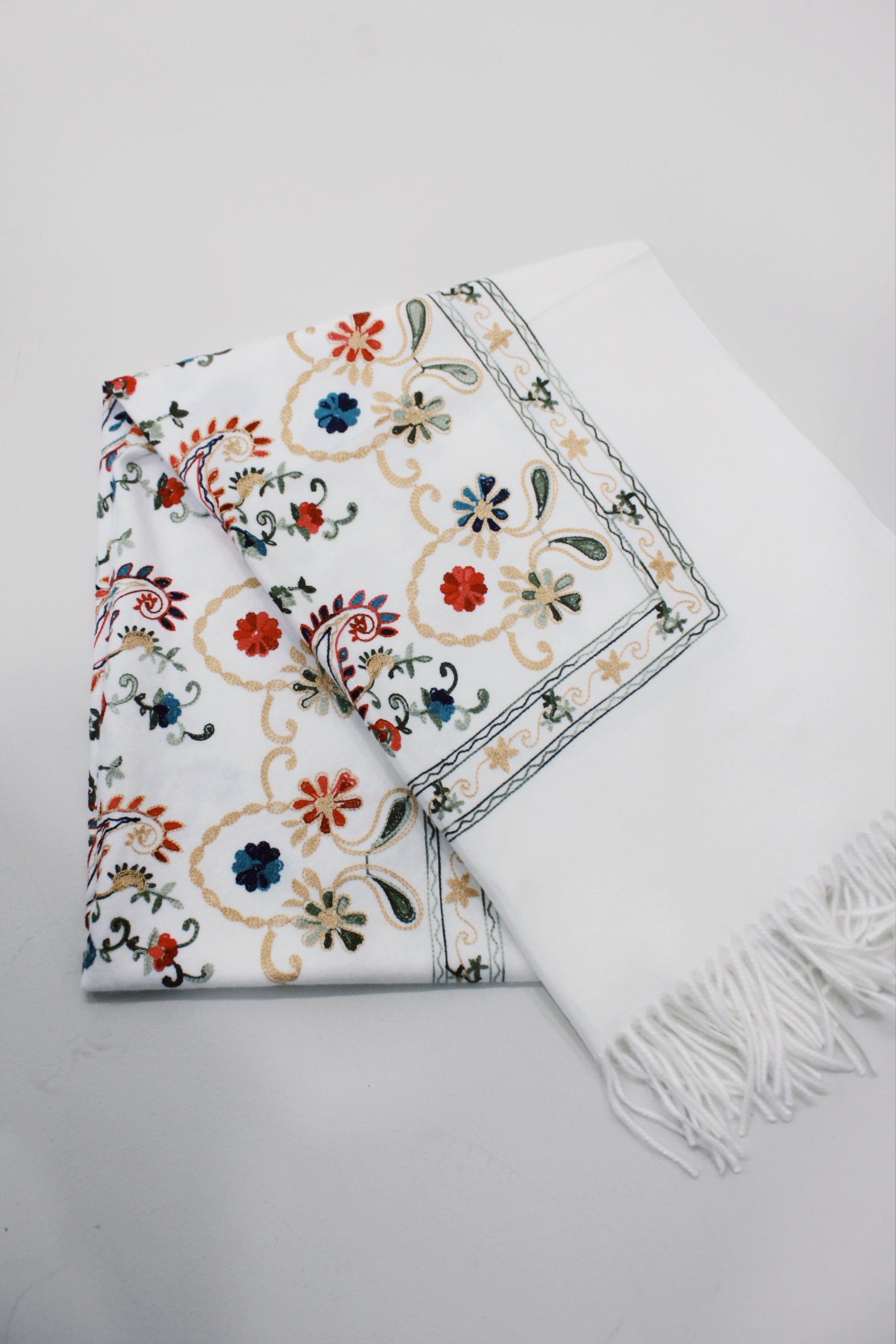 Cachecol cashmere 50% Viscose e 50% poliéster na cor branca com bordados e franjas. Produto revendido pela marca Yacamim.