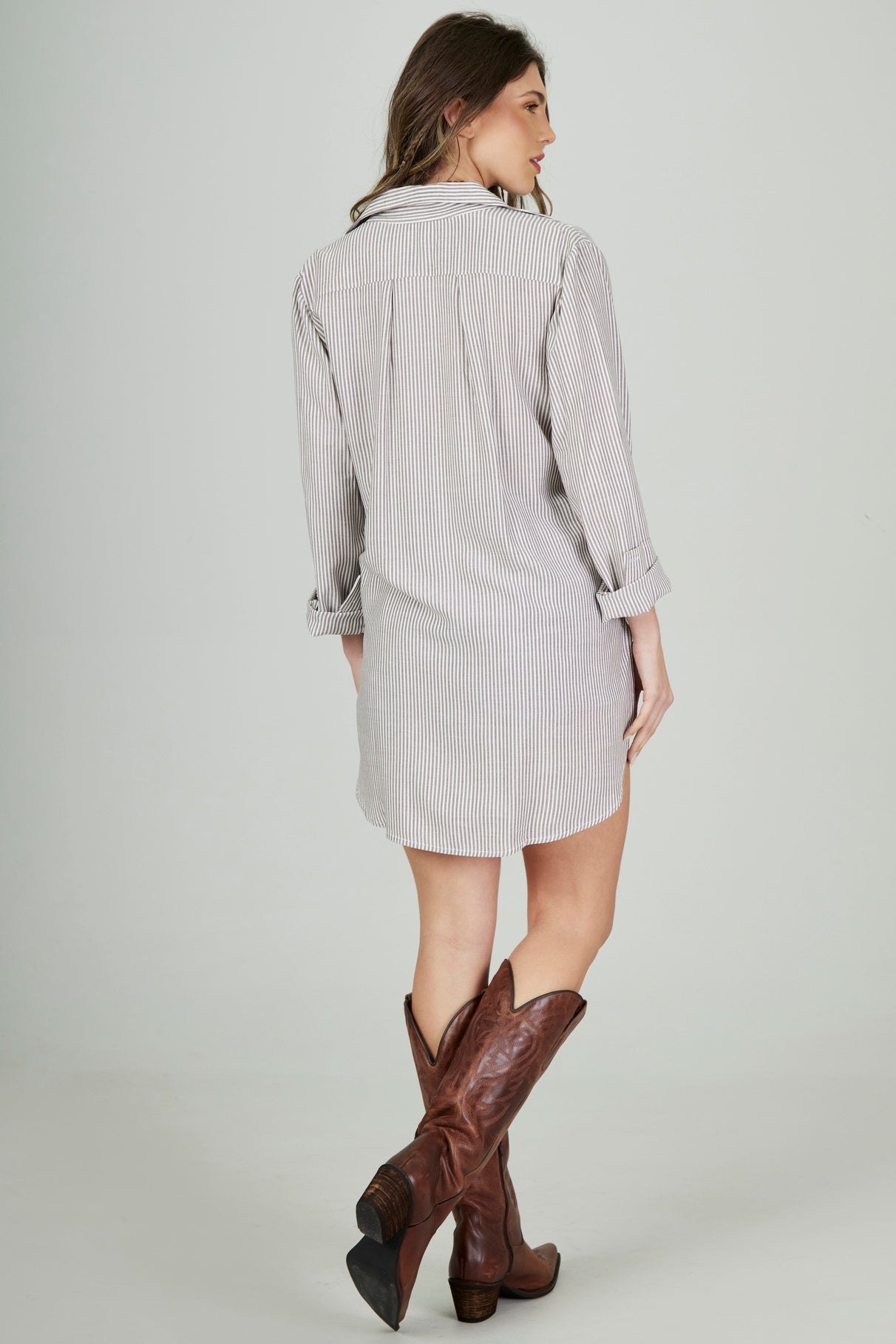 Detalhes Importantes: Modelagem ampla; Mangas longas; Bolsões frontais; Botões de madrepérola; Barra arredondada; Estampa listrada cinza escuro; Produzido pela marca Yacamim, 100% nacional; Acessórios não acompanham o produto; Pode apresentar variações de tonalidade nas fotos.
