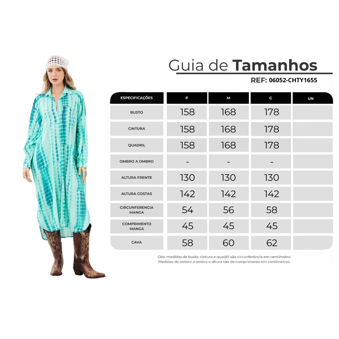 O modelo conta com mangas longas que trazem equilíbrio ao visual, fechamento frontal com botões em madrepérola que acrescentam delicadeza e refinamento, além de barras arredondadas que proporcionam acabamento moderno e diferenciado. A estampa digital tie dye em tons de verde imprime autenticidade e personalidade à peça, tornando-a ideal para produções que transitam do casual elegante a ocasiões especiais.