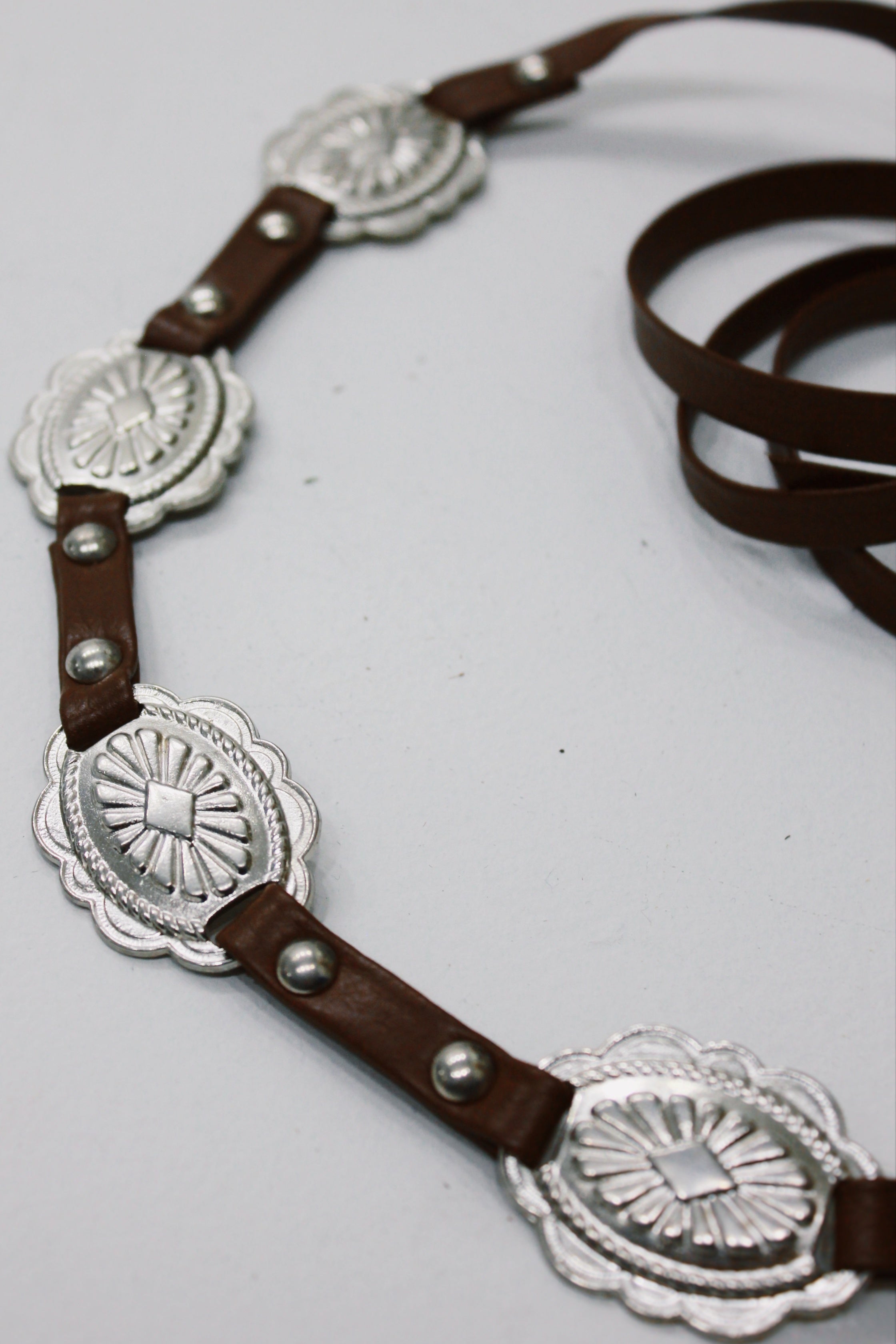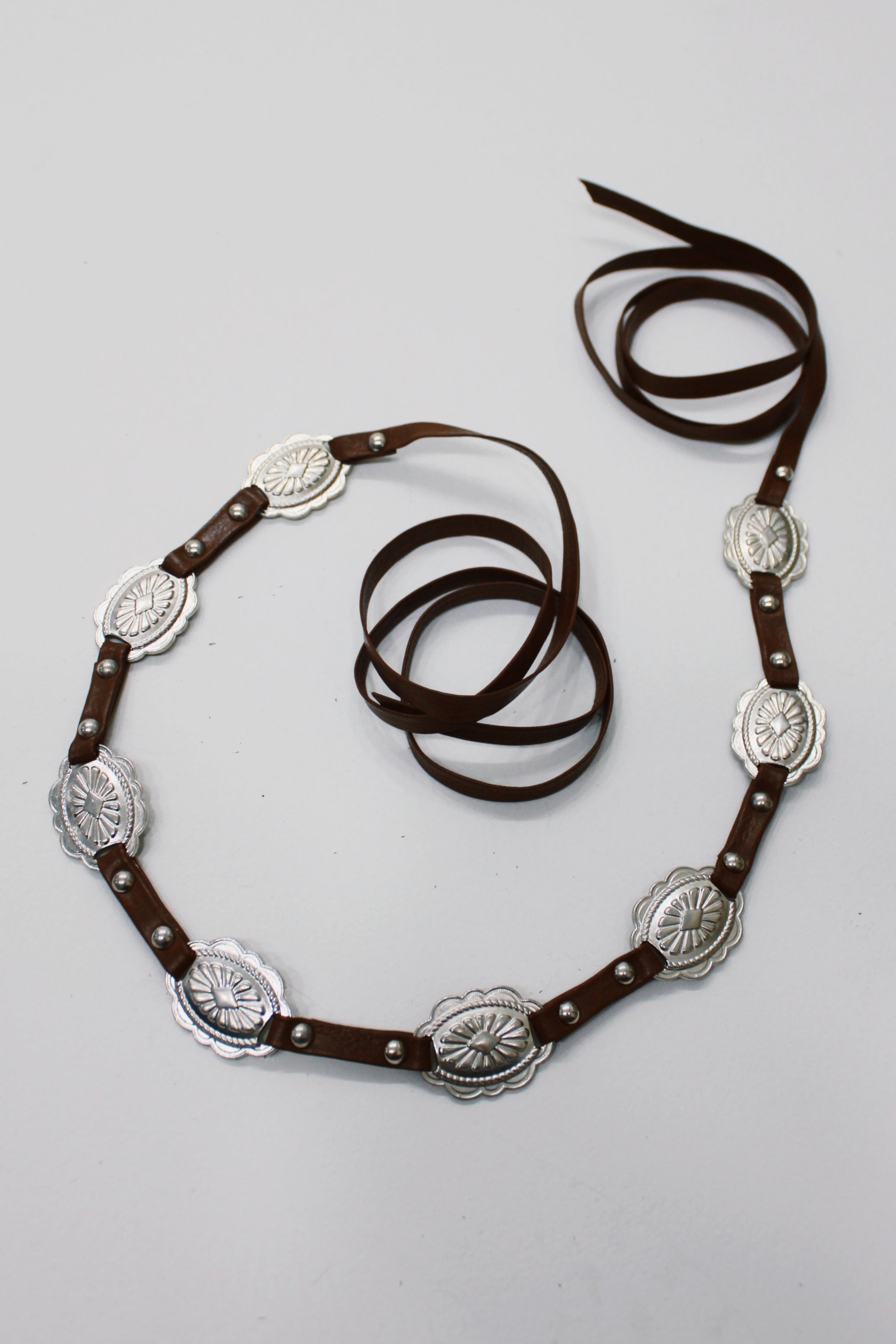 Cinto de courino marrom de tira fina de amarrar com detalhes metálicos. Produto revendido pela marca Yacamim.