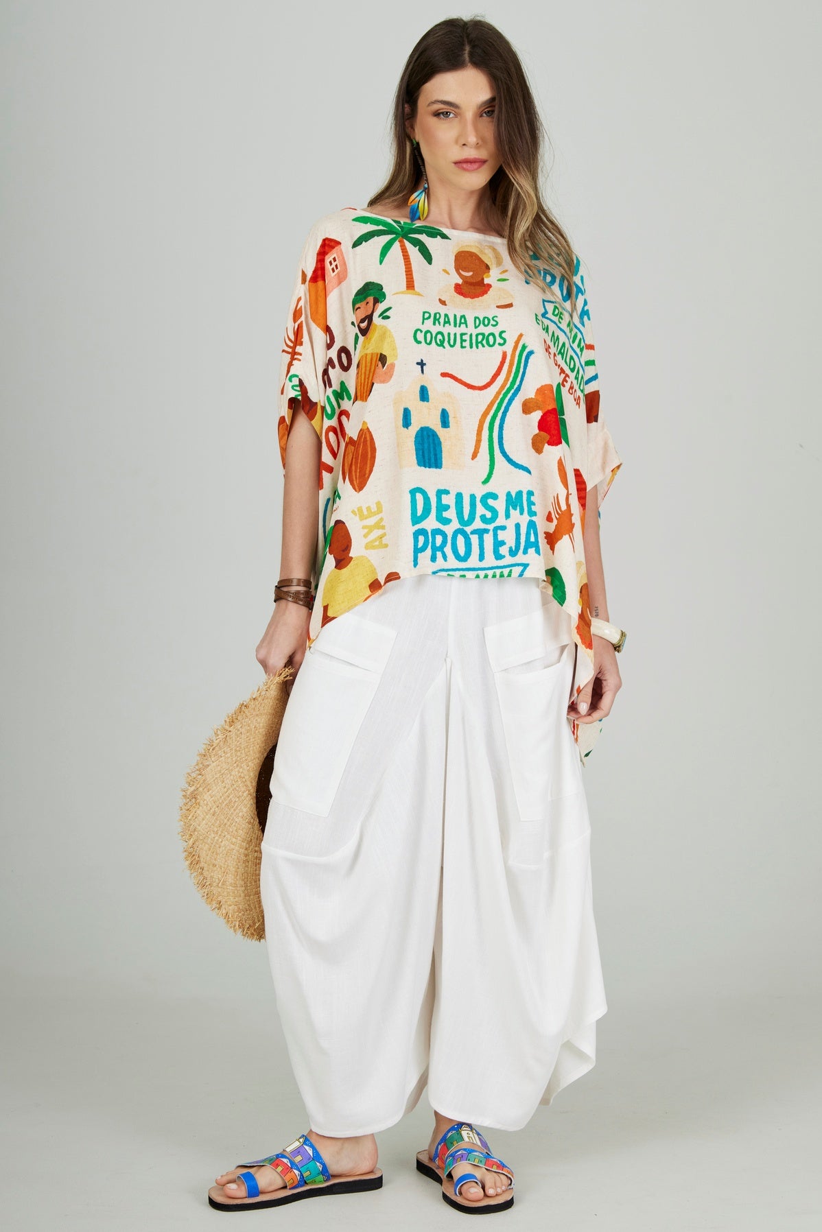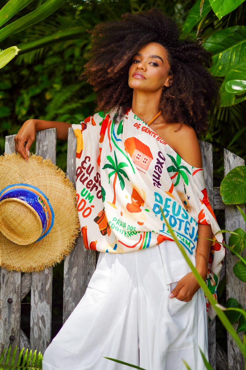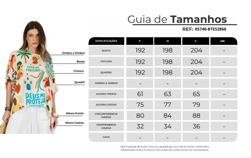 Com modelagem ampla, mangas 3/4 e decote canoa de ombro a ombro, a bata proporciona liberdade de movimento e um caimento elegante que valoriza o corpo com naturalidade. Sua estampa exclusiva da coleção Yacamim Bahêa reflete o DNA artístico da marca, inspirado na essência tropical e na beleza da natureza brasileira. Combine com calças leves, saias ou shorts para um look autêntico e cheio de personalidade.