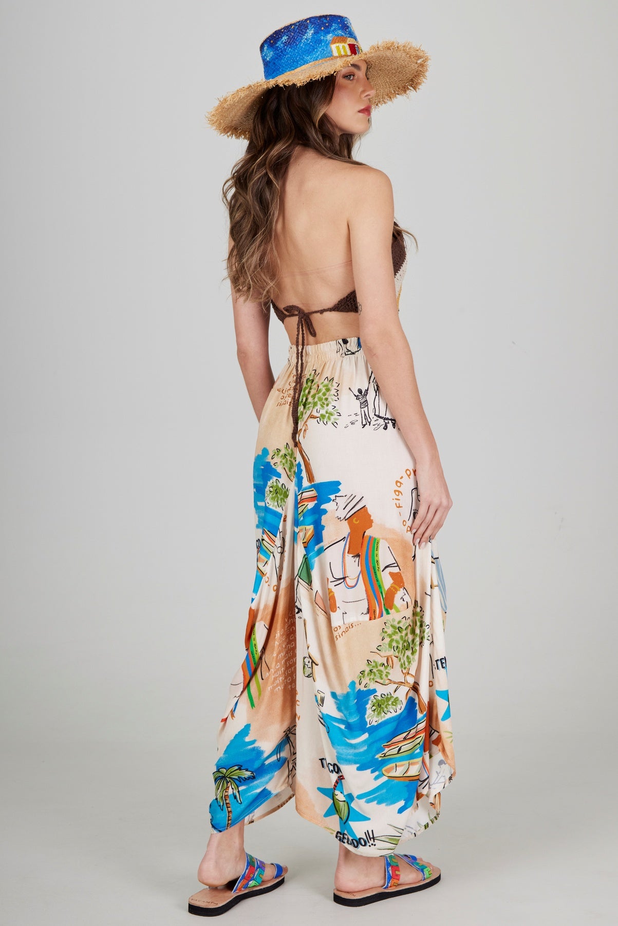 Seu design apresenta modelagem saruel, com cós elástico e bolsos frontais funcionais, garantindo praticidade e conforto. A estampa exclusiva da coleção Bahêa traduz a essência da natureza e da cultura brasileira, inspirando combinações que vão do casual chic ao boho refinado.