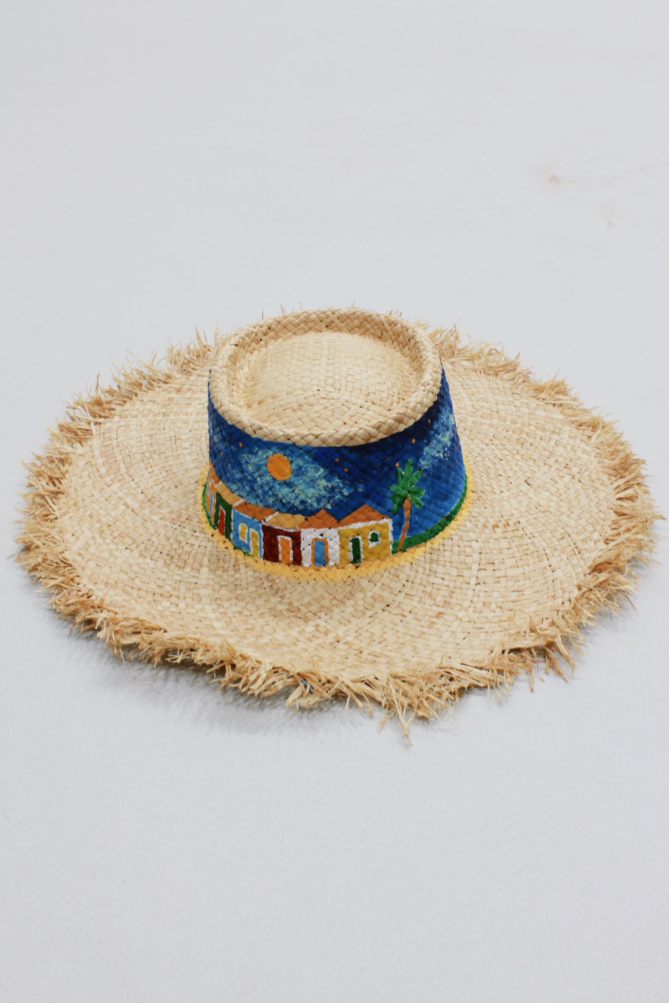 Chapéu de palha com pintura artesanal coleção Bahêa Yacamim. Produto revendido pela marca Yacamim.
