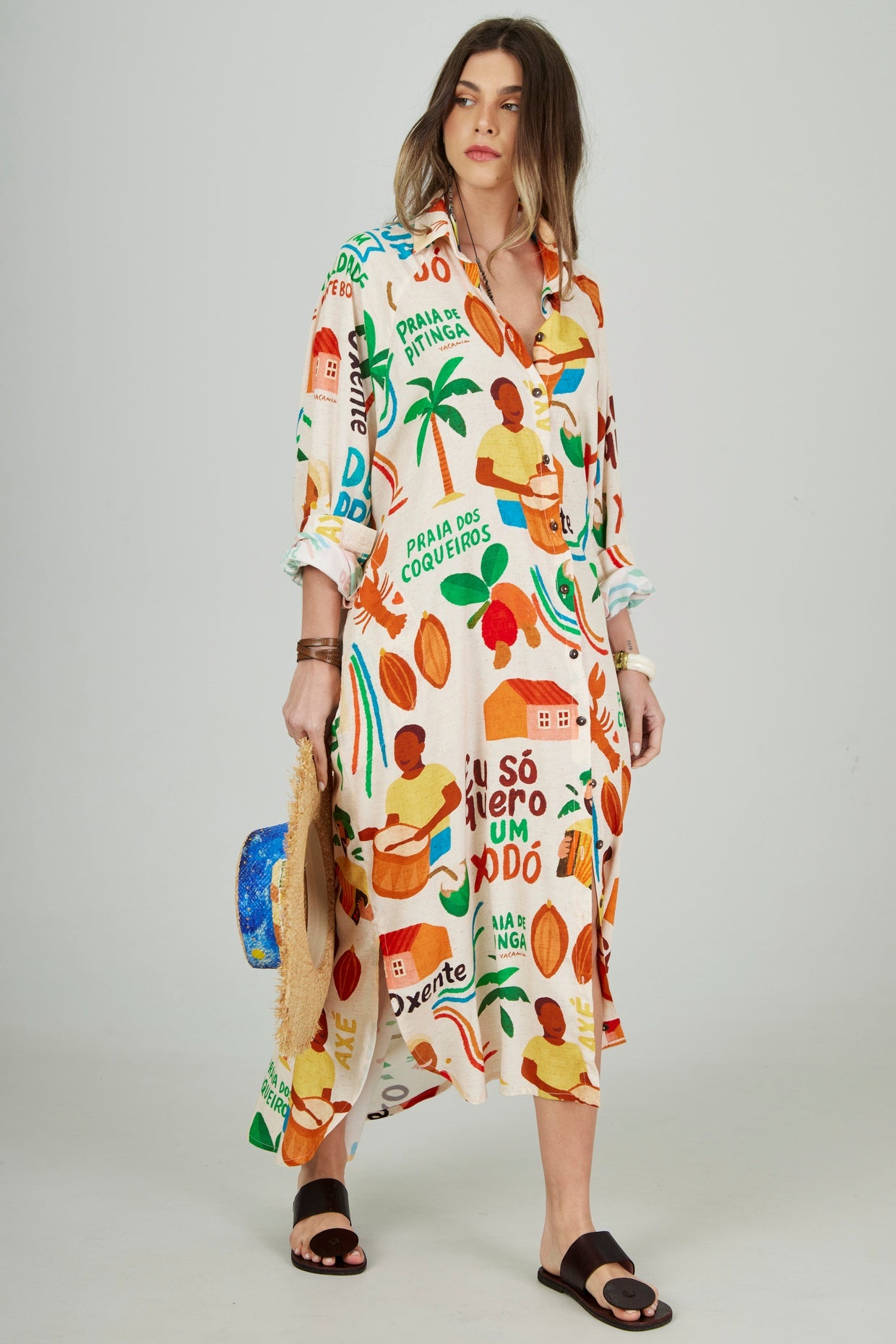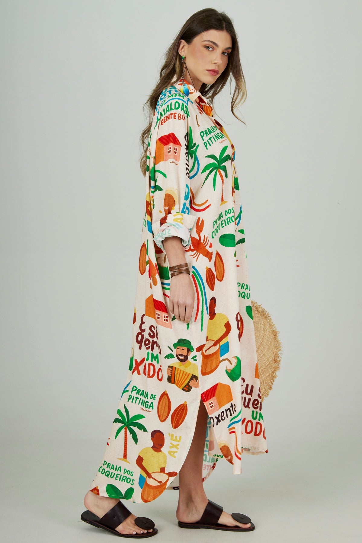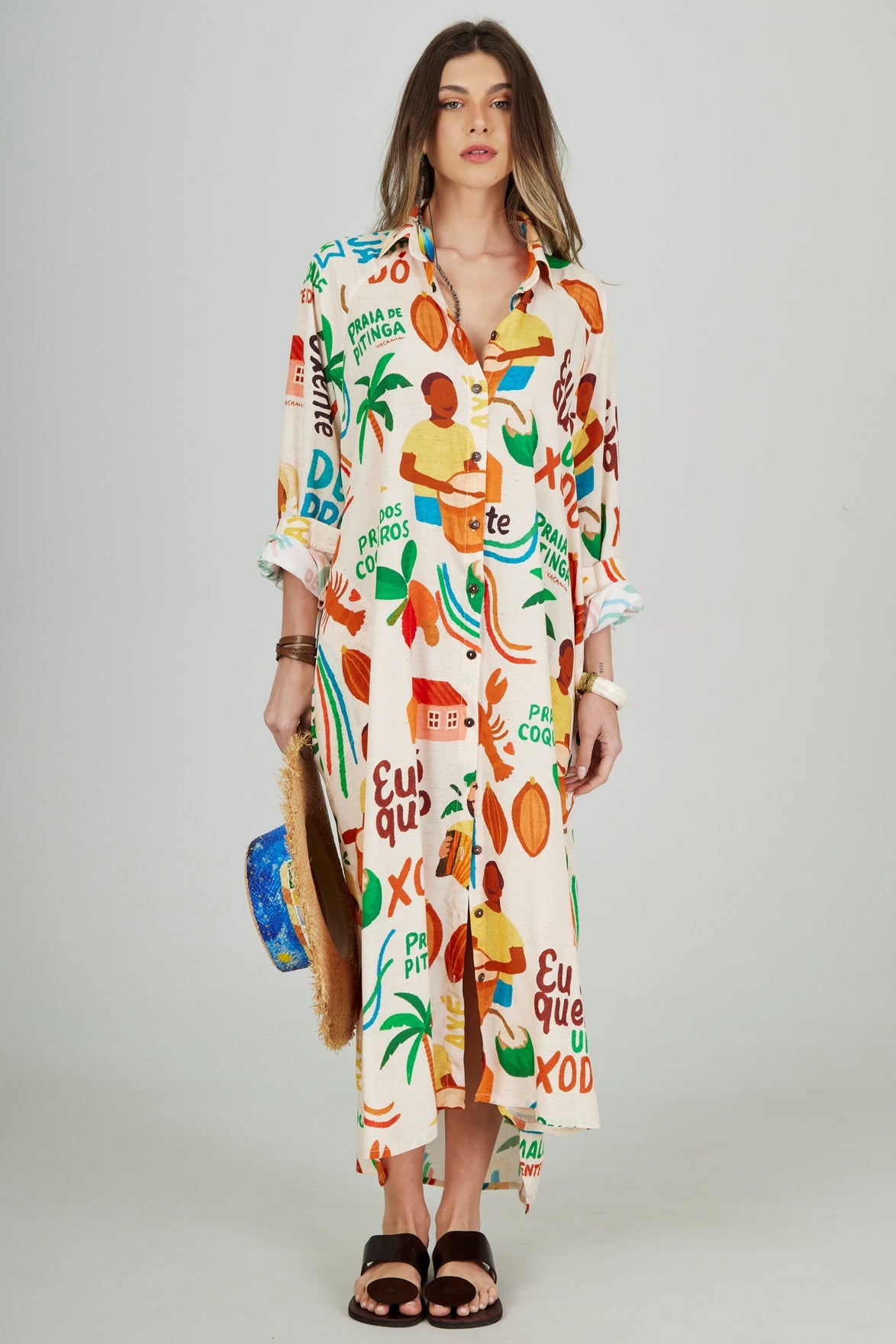 Com mangas longas, fendas laterais e barras arredondadas, a modelagem traz movimento e feminilidade. O fechamento frontal com botões de coco reforça o estilo natural e autêntico da marca, enquanto a estampa exclusiva da coleção Yacamim Bahêa traduz o espírito livre e tropical que inspira a coleção. Versátil e charmosa, pode ser usada como vestido ou sobreposição, compondo looks do dia a dia ou produções mais elaboradas com acessórios e sandálias.