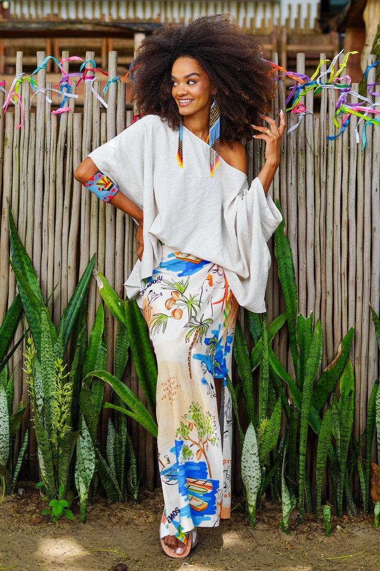 Confeccionada em 100% viscose, garante leveza e toque macio, sendo ideal para compor looks para o dia a dia ou ocasiões especiais. A estampa exclusiva da coleção Yacamim Bahêa adiciona personalidade única à sua produção.