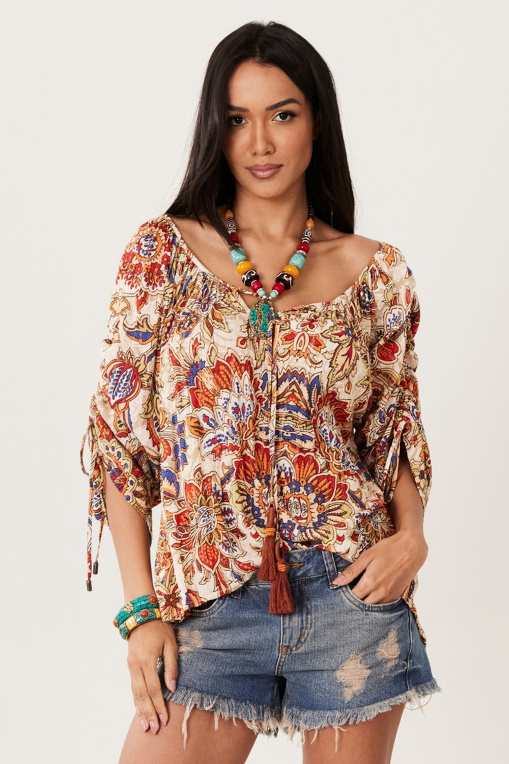 Bata Ciganinha Com Mangas Longas Bege Estampado Yacamim B5