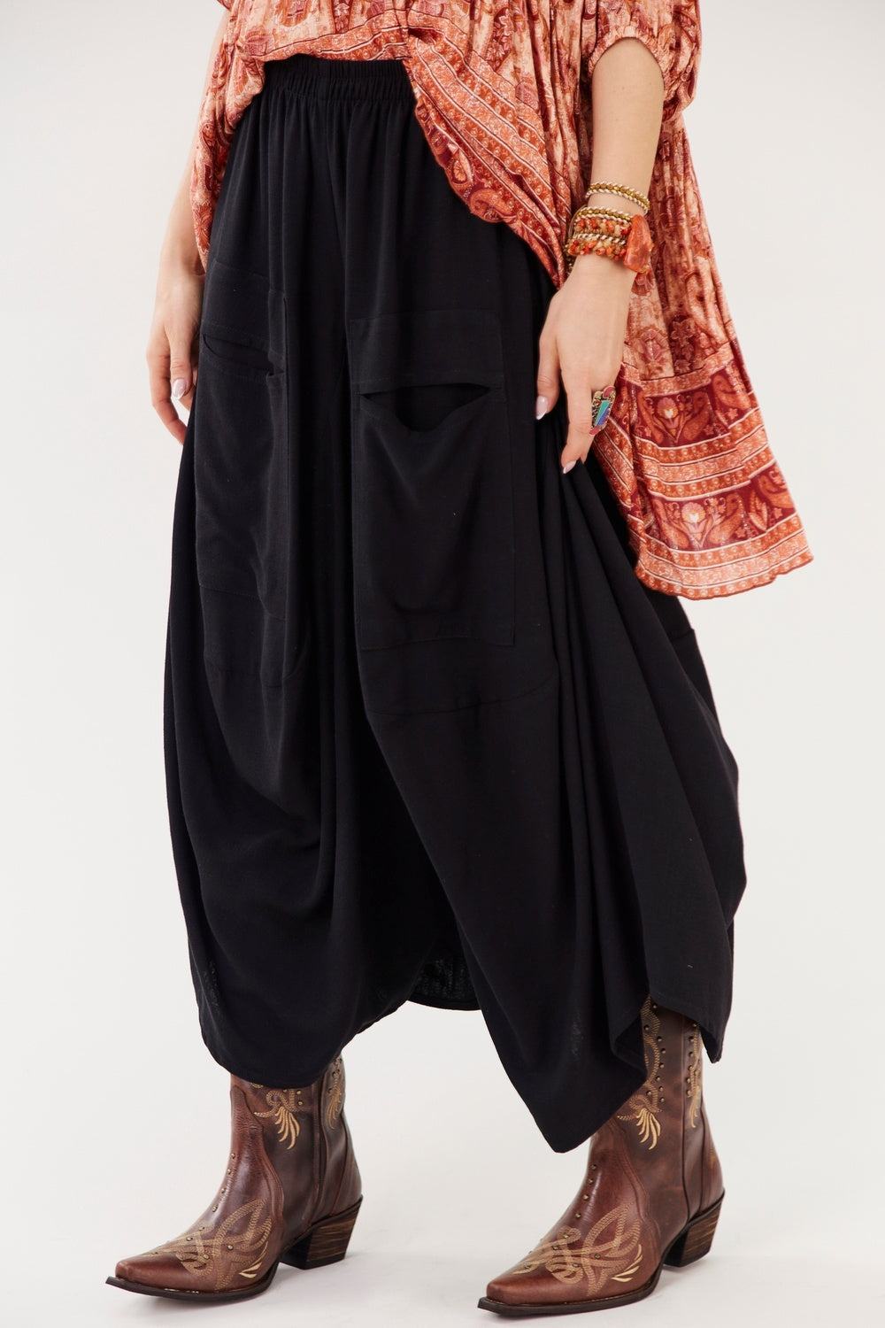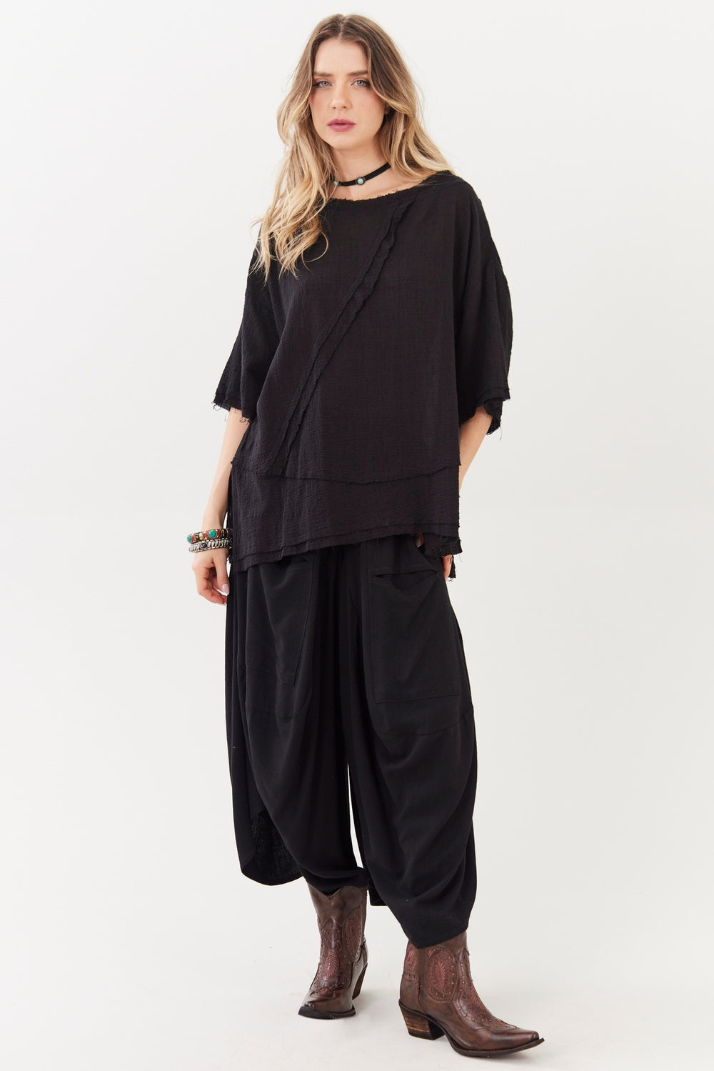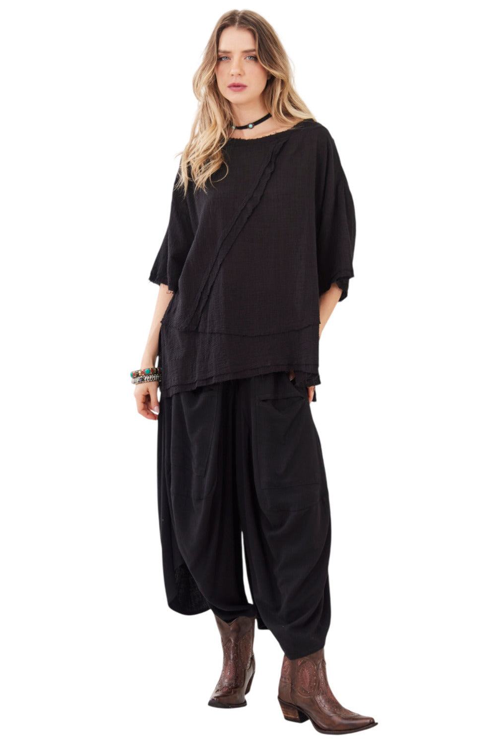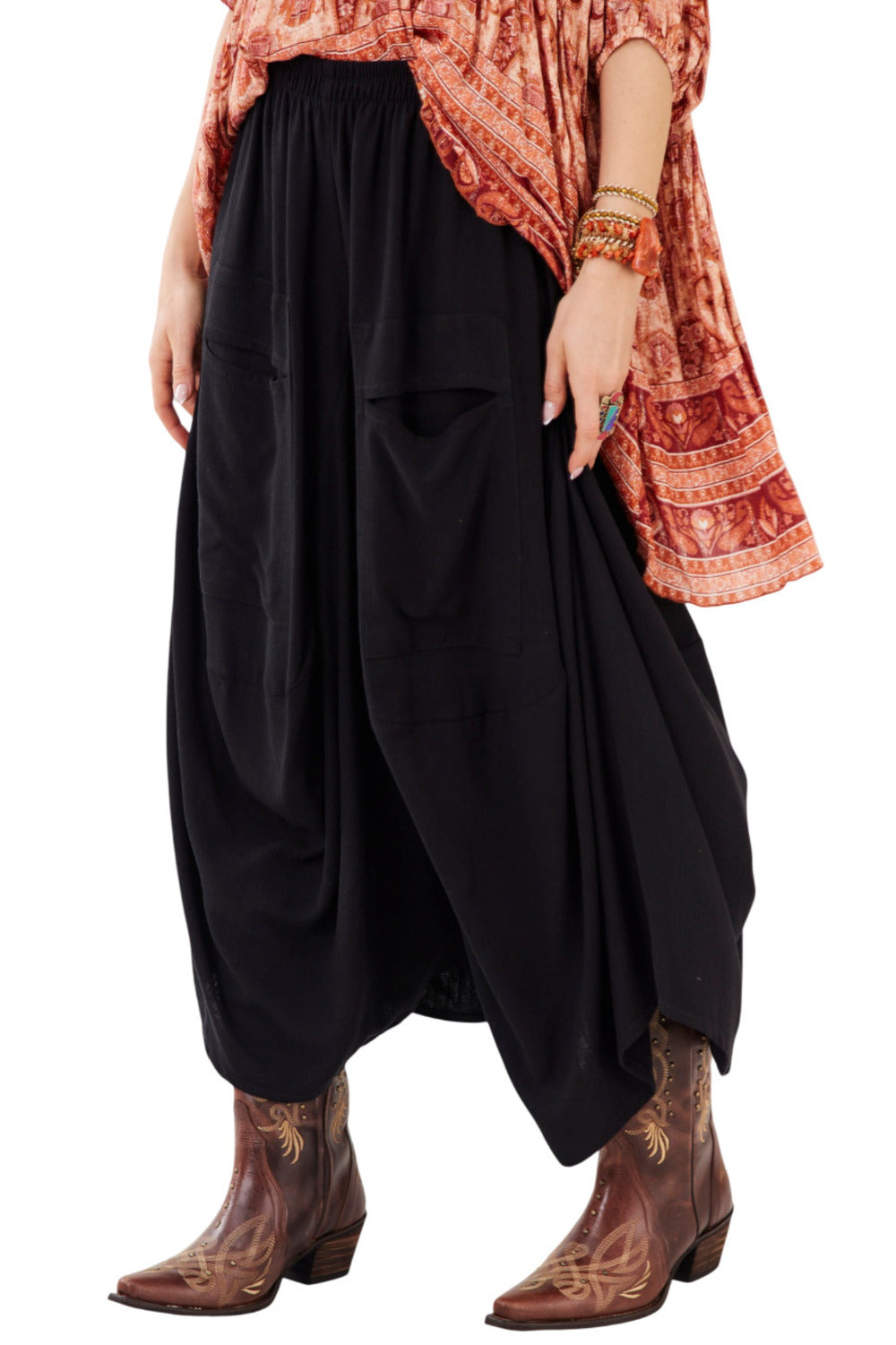 Os bolsões frontais agregam funcionalidade e reforçam o estilo despojado da peça. O elástico no cós proporciona ajuste confortável ao corpo, enquanto os detalhes de recortes enriquecem o acabamento e valorizam o design. Confeccionada em tecido de 80% Viscose e 20% Linho, a calça une a leveza e fluidez da viscose com a textura sofisticada do linho. O resultado é uma peça respirável, com ótimo caimento e estrutura na medida certa. A cor preta traz versatilidade e atemporalidade, permitindo composições que vão do casual ao elegante com facilidade.
