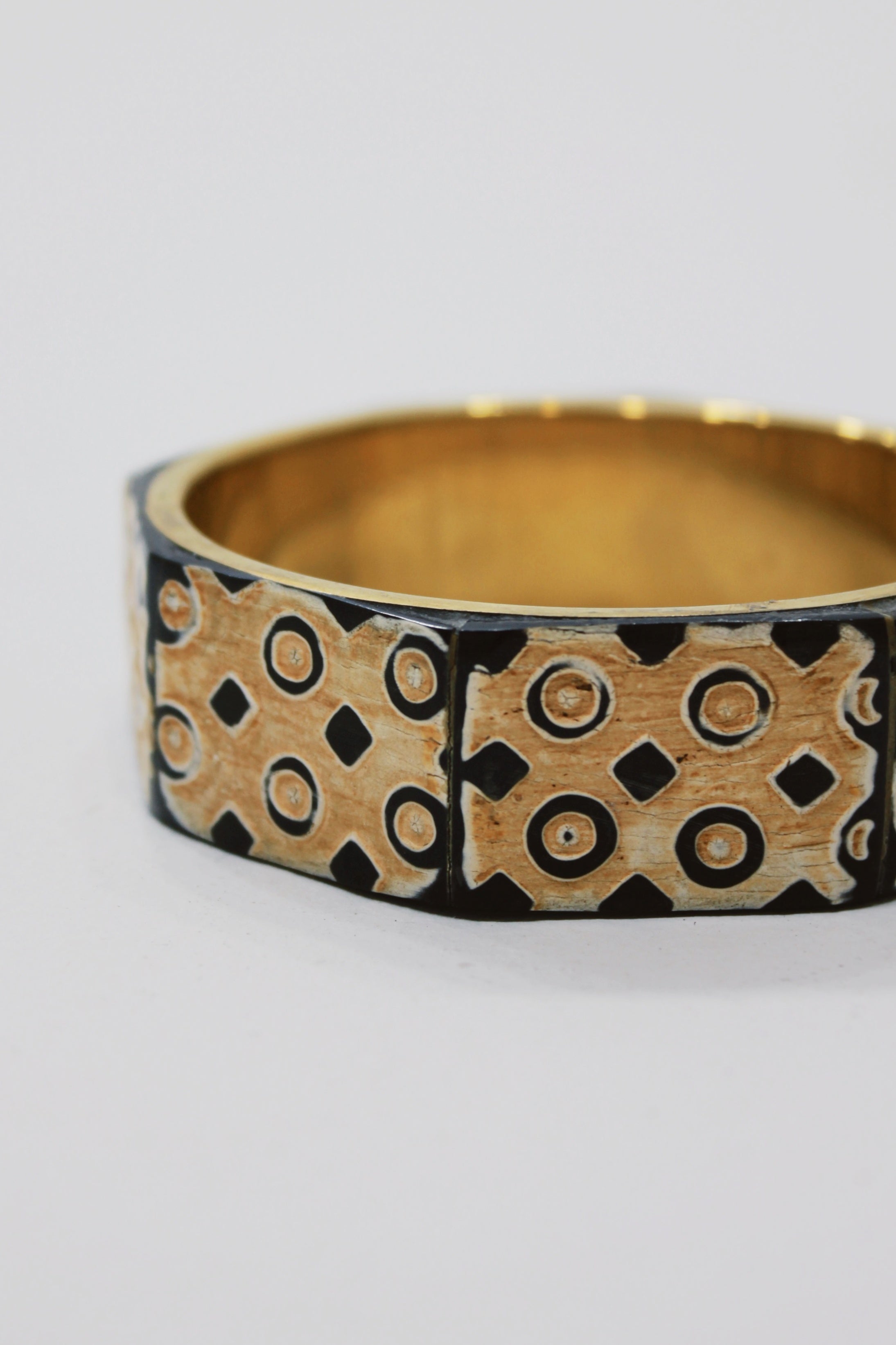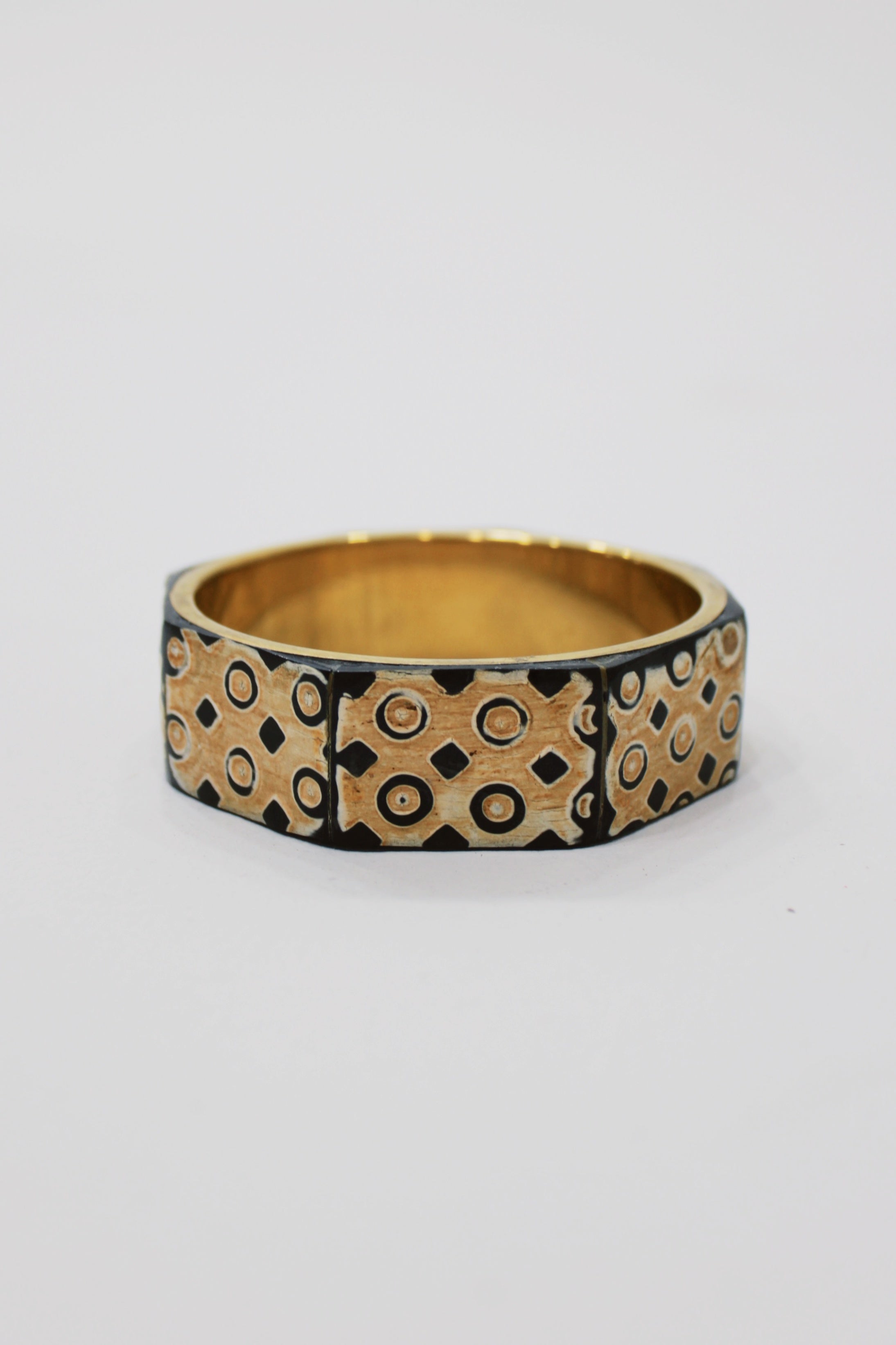 Pulseira modelo bracelete de metal com madeira. Produto revendido pela marca Yacamim.