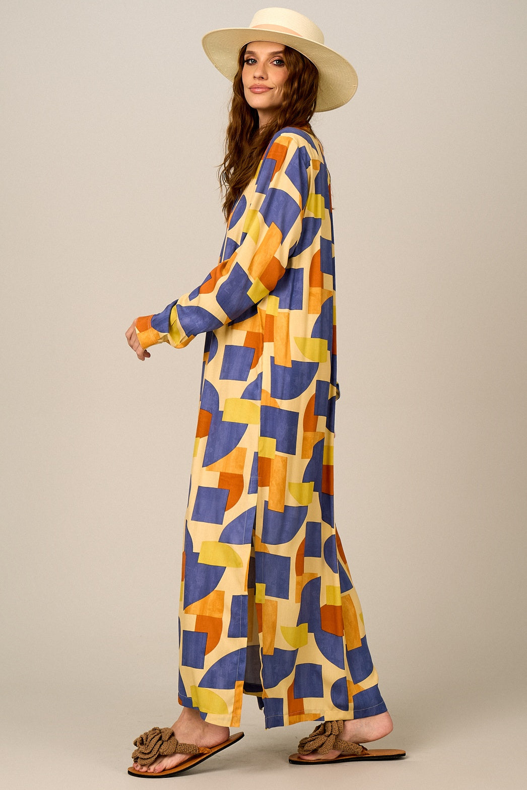A Chemise Longa Ampla Estampa Geométrica Yacamim é uma peça que combina leveza, estilo e autenticidade em um único design. Seu caimento fluido e modelagem ampla proporcionam conforto e elegância, enquanto as mangas longas e as fendas laterais conferem movimento e charme ao visual. Os botões de coco completam o acabamento artesanal, reforçando a essência natural e exclusiva da marca.