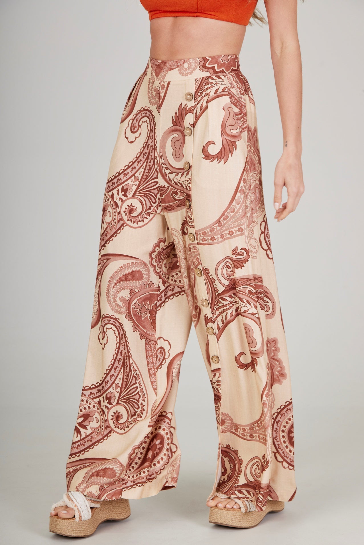 Calça Pantalona Bege Estampa Cashmere Yacamim A36