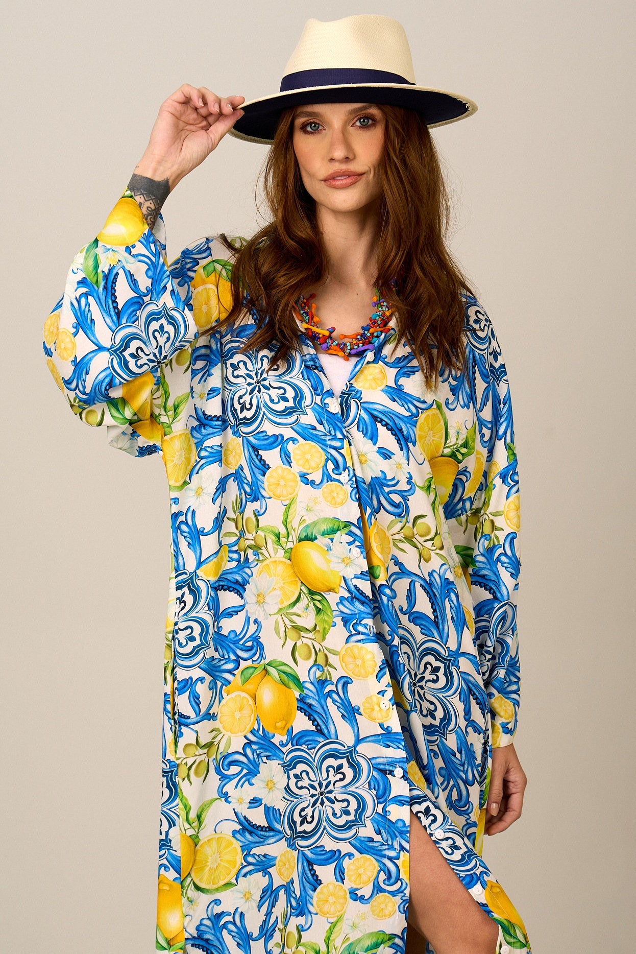 O design elegante apresenta mangas longas, bolsos laterais, fendas laterais sutis que proporcionam movimento e um toque moderno, além de botões brancos delicados que complementam a alegre estampa de limões, trazendo frescor e um ar sofisticado. Use-o fechado como vestido para um look casual chic ou aberto como sobreposição para um estilo despojado e contemporâneo.