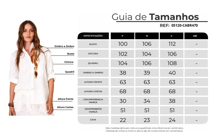 Destaques da peça: Mangas 3/4 dobradas com presilha no punho para um visual moderno Botões de madrepérola, dando um toque de sofisticação e elegância Gola redonda que traz um ar delicado à peça Composição 100% linho, proporcionando frescor e conforto Cor branca, ideal para composições versáteis e elegantes.