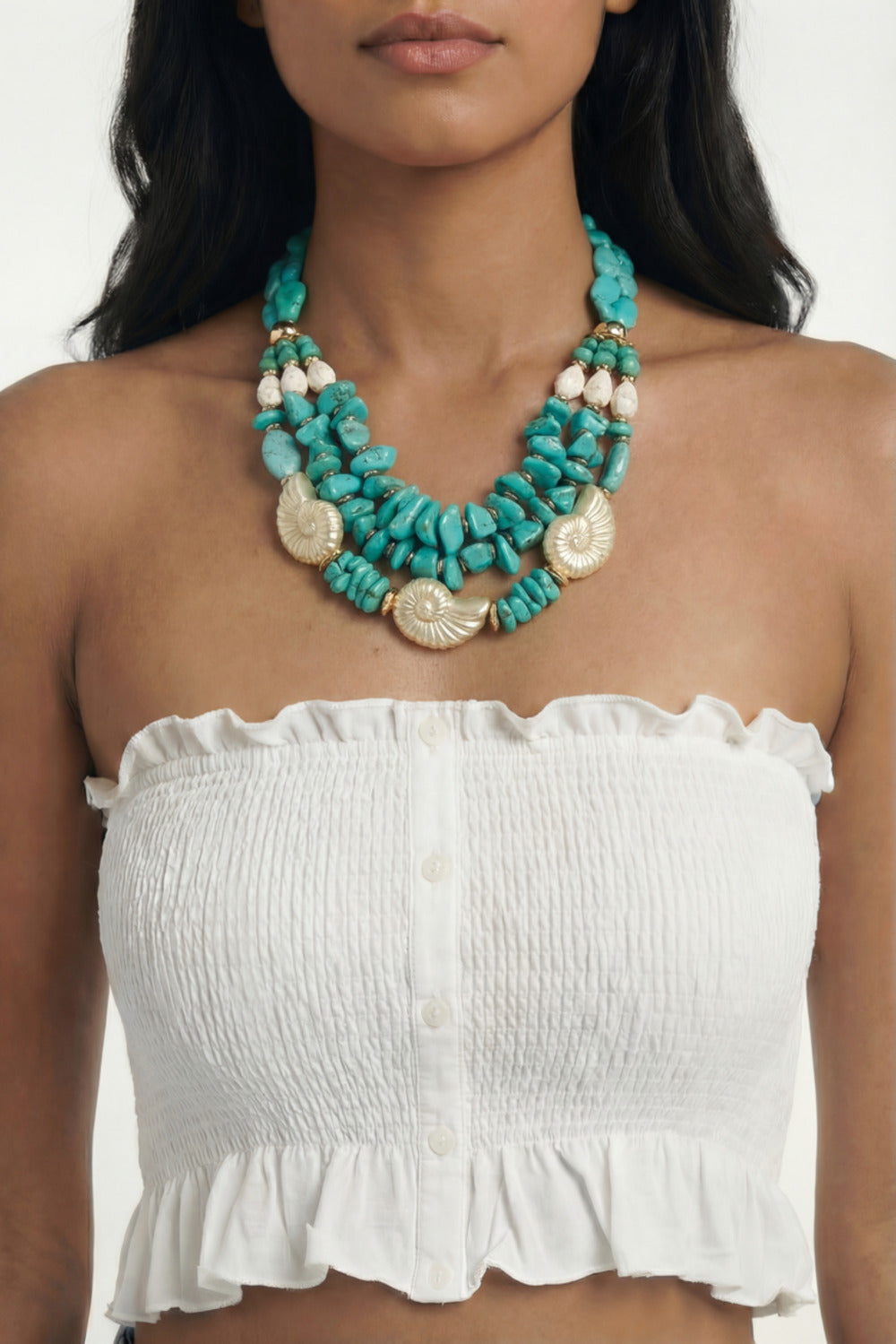 Colar artesanal com pedras verdes e pingentes em formato de conchas. Produto revendido pela marca Yacamim.