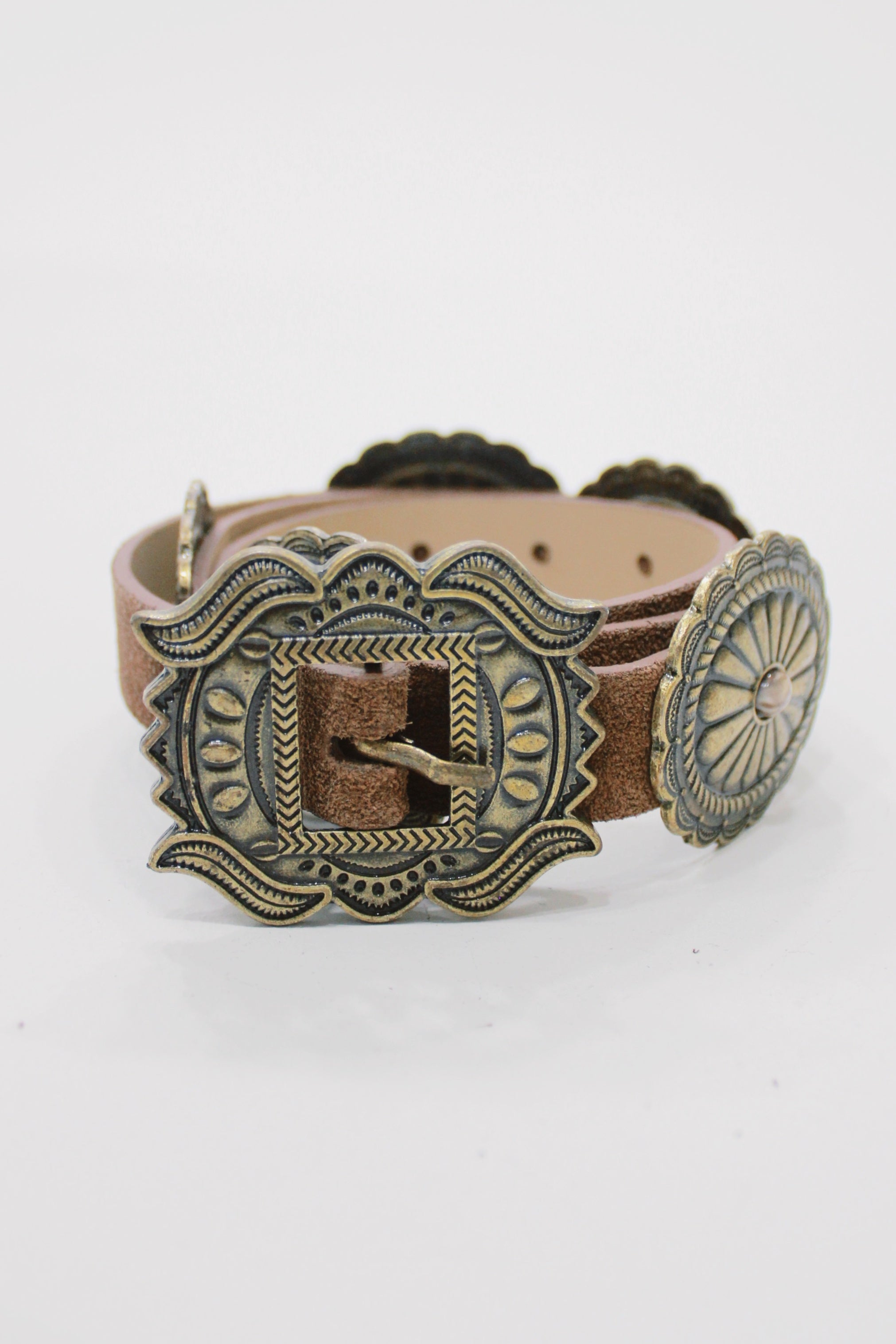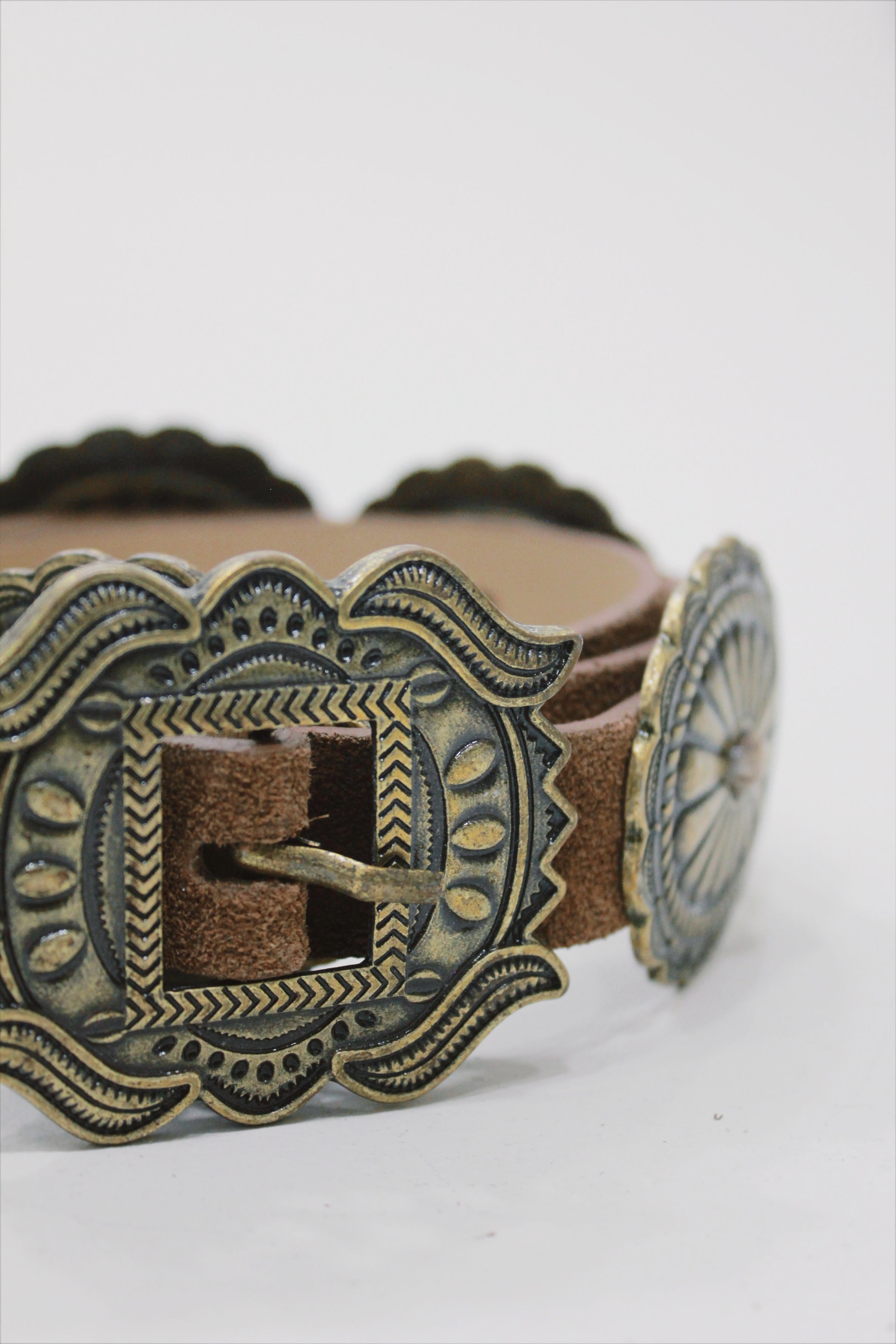 Cinto de couro marrom com fivela trabalhada em ouro velho com pedras. Produto revendido pela marca Yacamim.