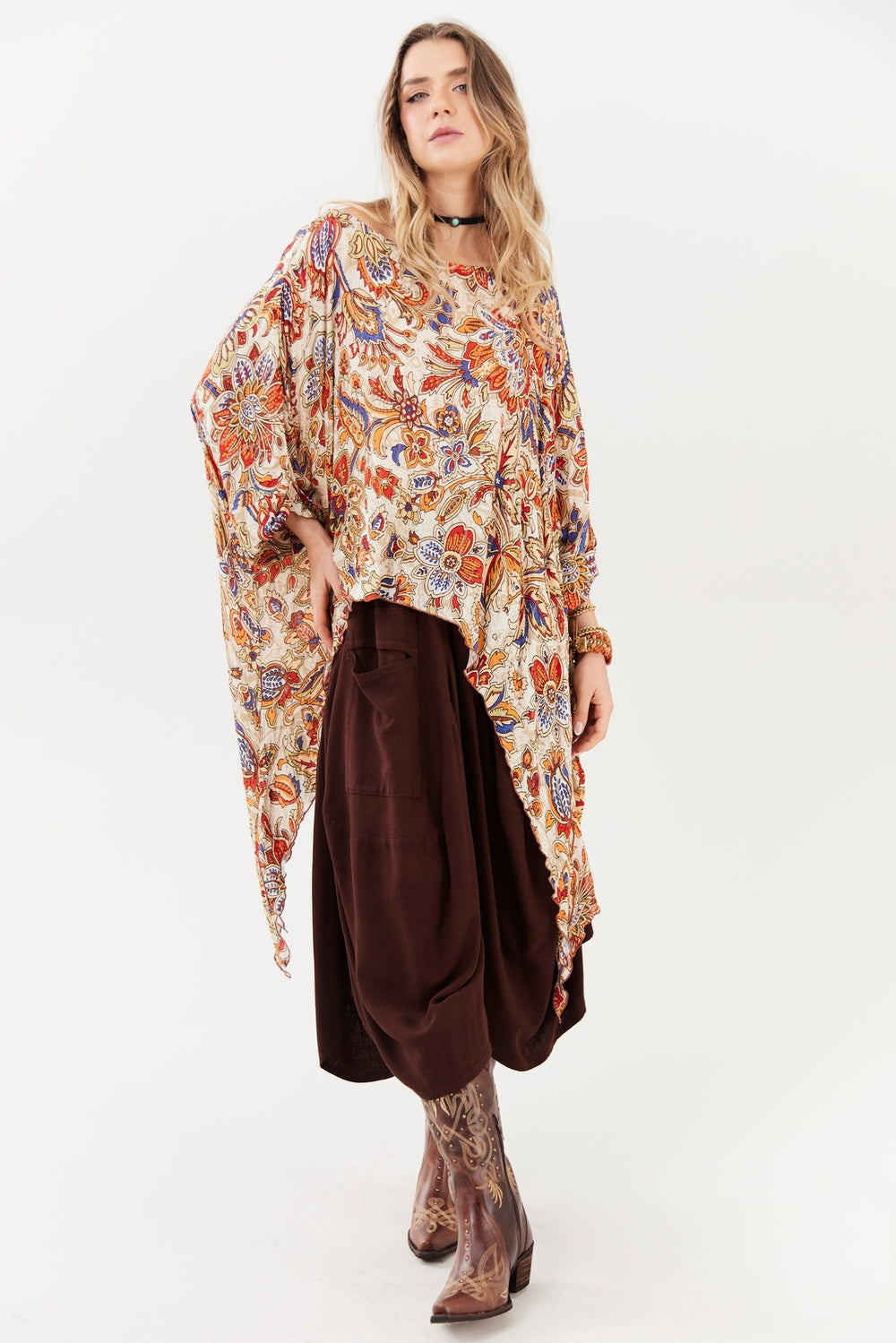 O destaque especial fica por conta das pontas laterais, que adicionam assimetria e fluidez ao caimento, tornando a peça ainda mais marcante. Confeccionada em 99% viscose e 1% poliamida, possui toque macio, excelente respirabilidade e leve estrutura, garantindo conforto durante todo o uso. A estampa em tom bege confere sofisticação e atemporalidade, facilitando combinações com diversas propostas de look.