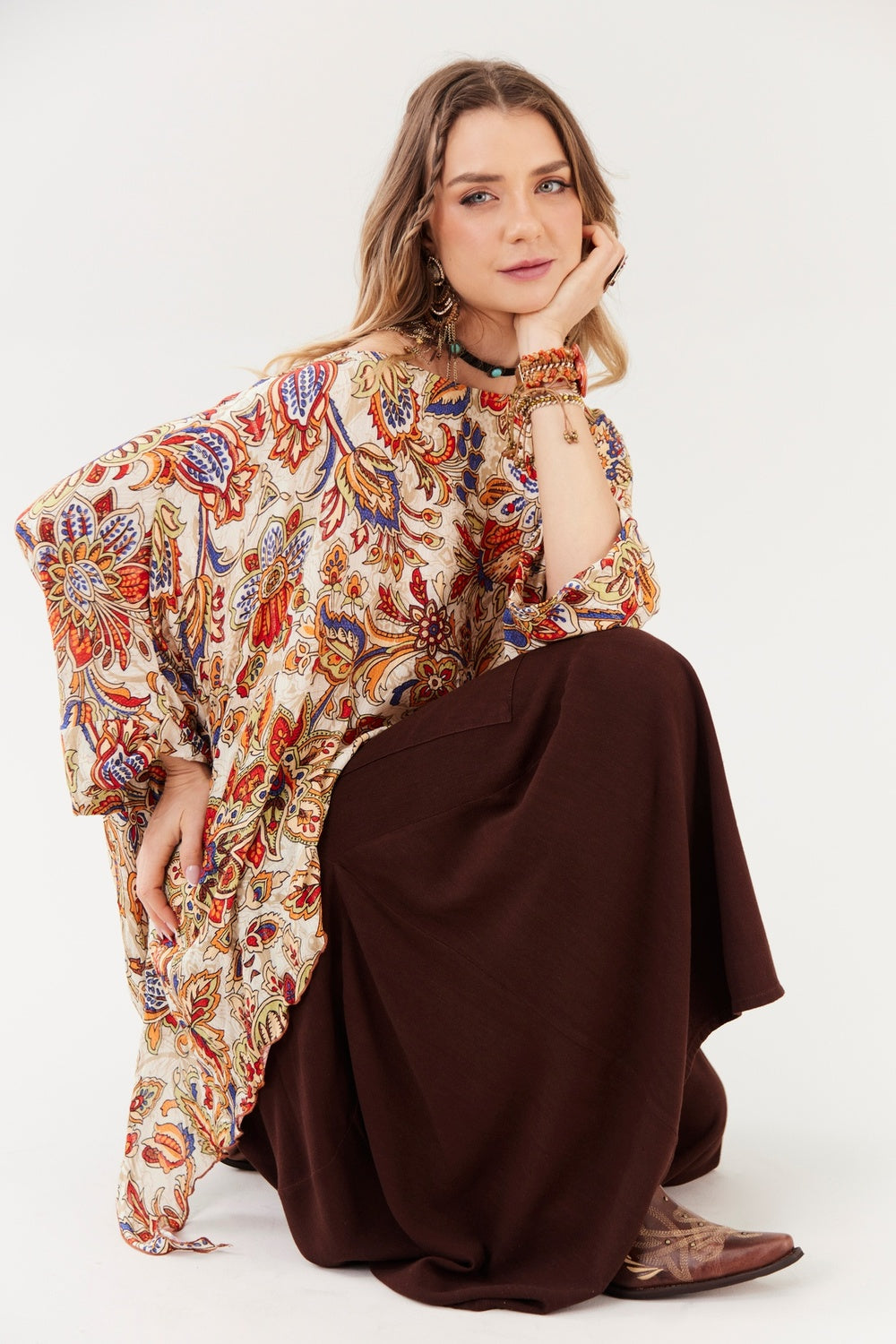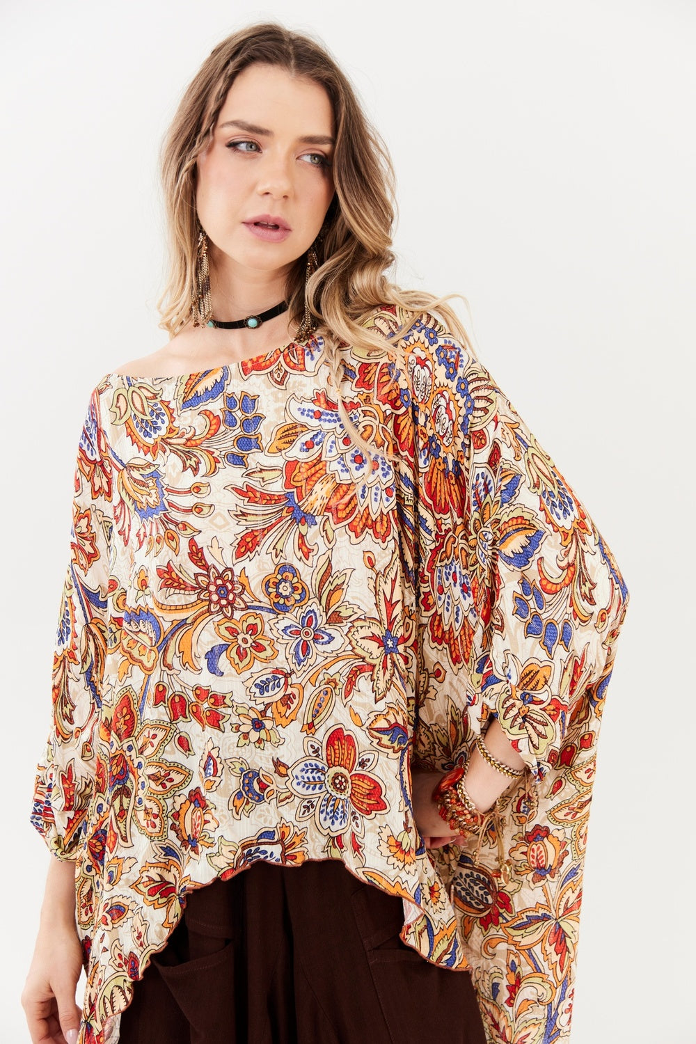 A Bata Ampla Manga Longa Ombro a Ombro Pontas Laterais Bege Estampado Yacamim é a escolha ideal para quem busca elegância com personalidade. Com modelagem ampla e fluida, a peça proporciona leveza e movimento, criando um visual sofisticado e confortável ao mesmo tempo. O decote ombro a ombro valoriza o colo com delicadeza e feminilidade, enquanto as mangas longas equilibram a silhueta e trazem versatilidade para diferentes ocasiões.