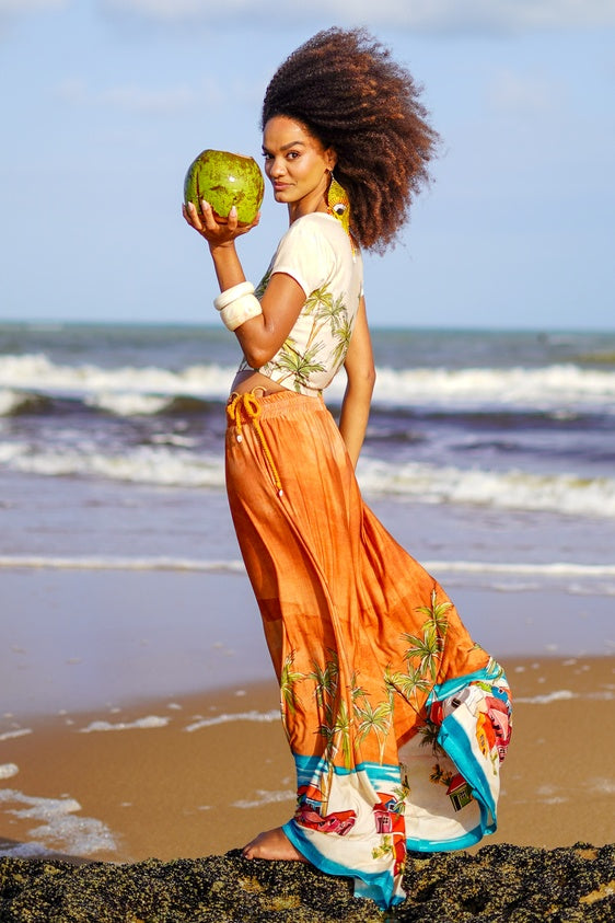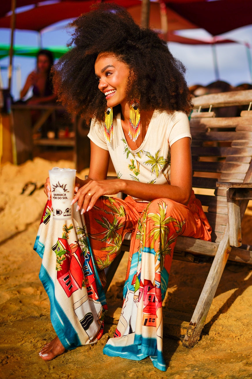 Inspirada nas cores da cocada, do dendê e do cacau, a estampa traz o colorido das casinhas e as charmosas igrejinhas que refletem a energia leve e vibrante desse pedaço encantado da Bahia.