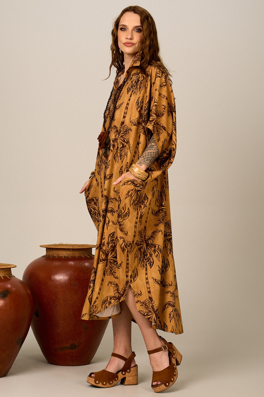 Confeccionado em viscolinho leve e respirável, composto por 70% Viscose e 30% Linho, o tecido oferece toque macio, conforto térmico e aparência naturalmente elegante. A estampa de coqueiros em tons de marrom transmite uma sensação tropical e sofisticada, perfeita para quem valoriza estilo com essência natural.