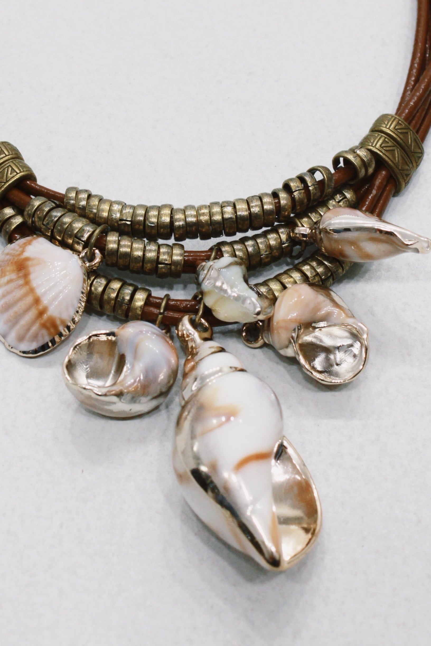 Colar artesanal com pingente de conchas. Produto revendido pela marca Yacamim.