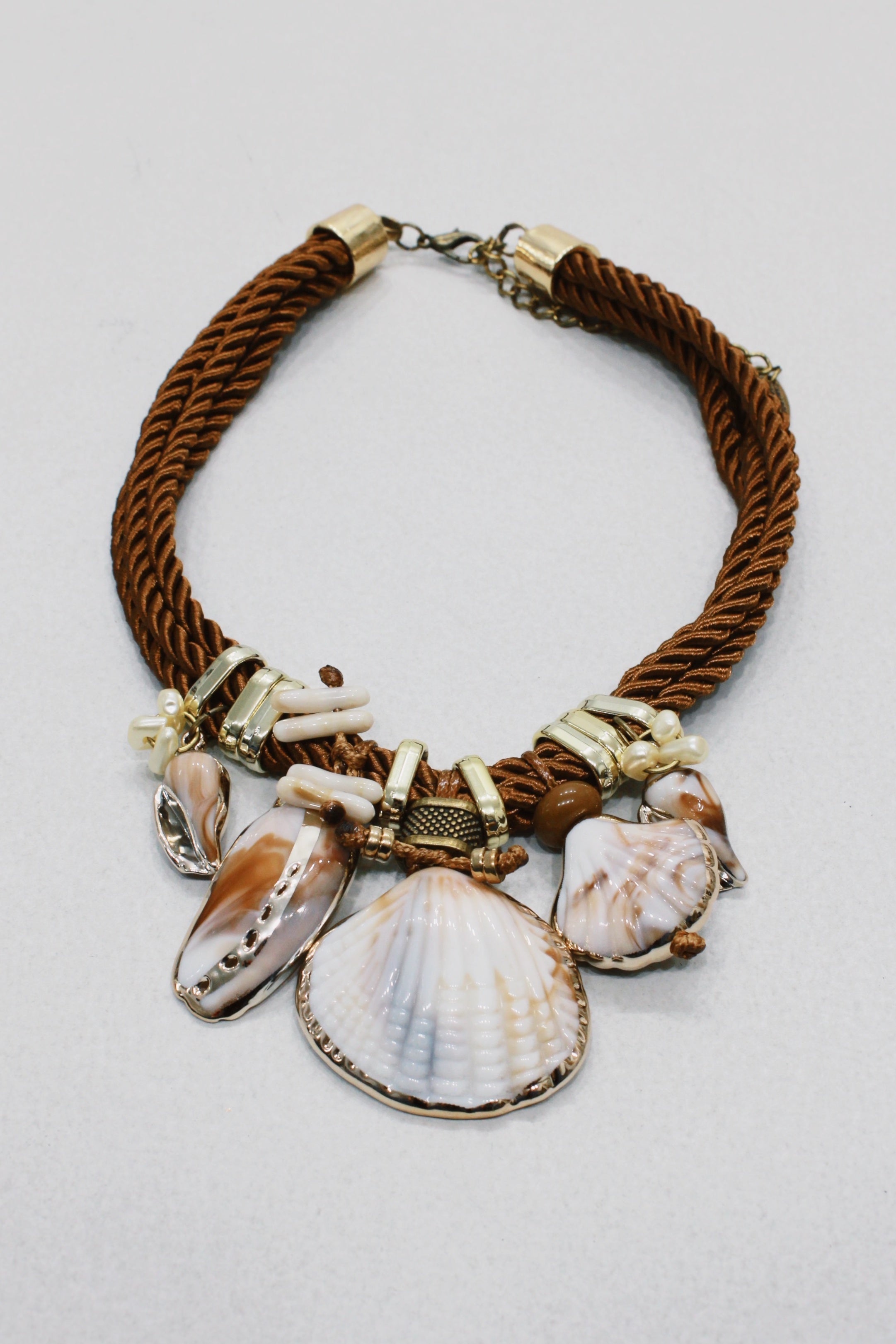Colar artesanal com pingente de conchas. Produto revendido pela marca Yacamim.