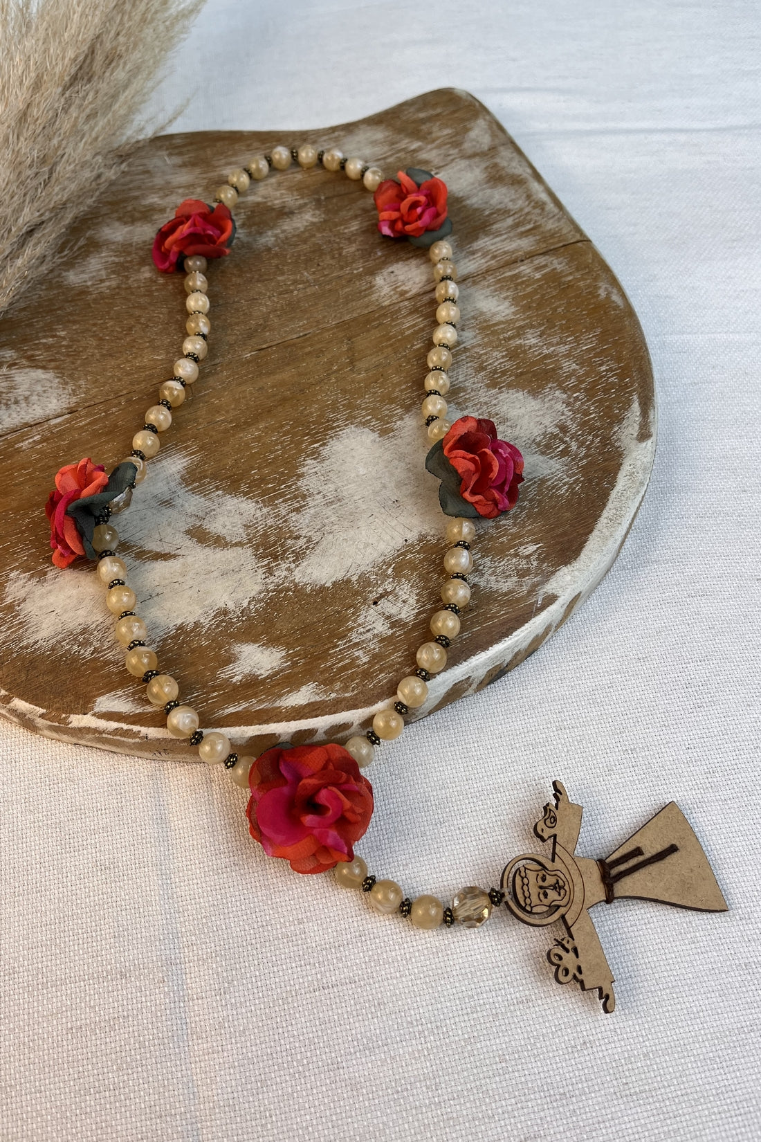 Colar terço na cor bege com detalhe de São Francisco de Assis de madeira. Produto revendido pela marca Yacamim.