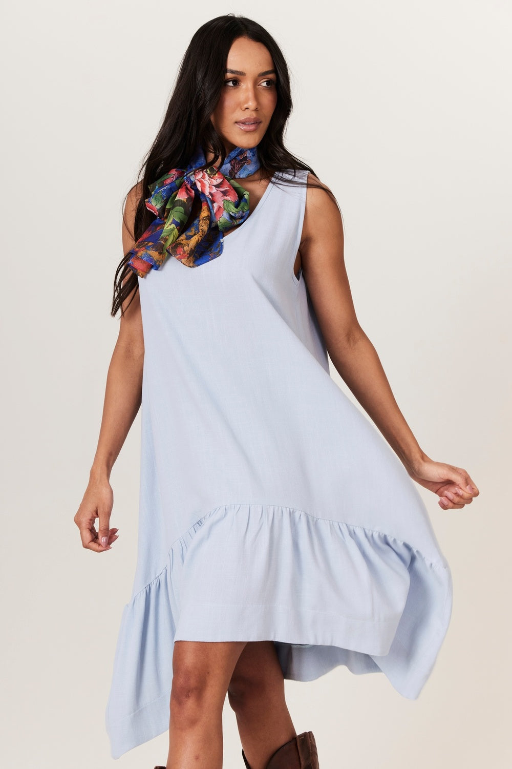 Vestido Curto Regata De Viscolinho Com Pontas Azul Claro Yacamim D15