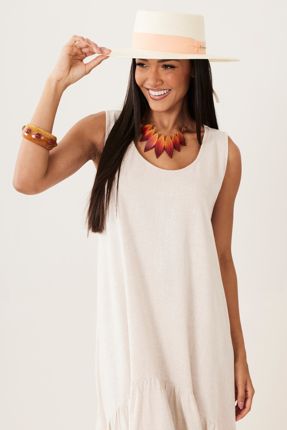 O Vestido Regata de Viscolinho Yacamim é uma peça versátil e elegante, ideal para quem busca conforto aliado a um visual moderno e atemporal. Confeccionado em viscolinho, combina a leveza da viscose com a textura natural do linho, proporcionando ótimo caimento e respirabilidade.